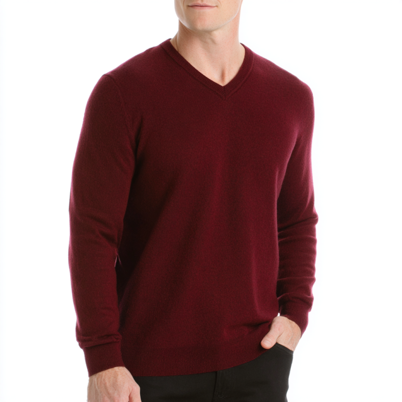 A luxurious and lightweight sweater crafted from 100% 2-ply cashmere, perfect for cooler seasons. This V-neck sweater in a rich burgundy shade offers a soft and warm feel while maintaining a sleek, refined look. Designed for men in size XL, it features ribbed cuffs, hem, and neckline to ensure a comfortable fit. Ideal for layering or wearing on its own for a polished, timeless style.