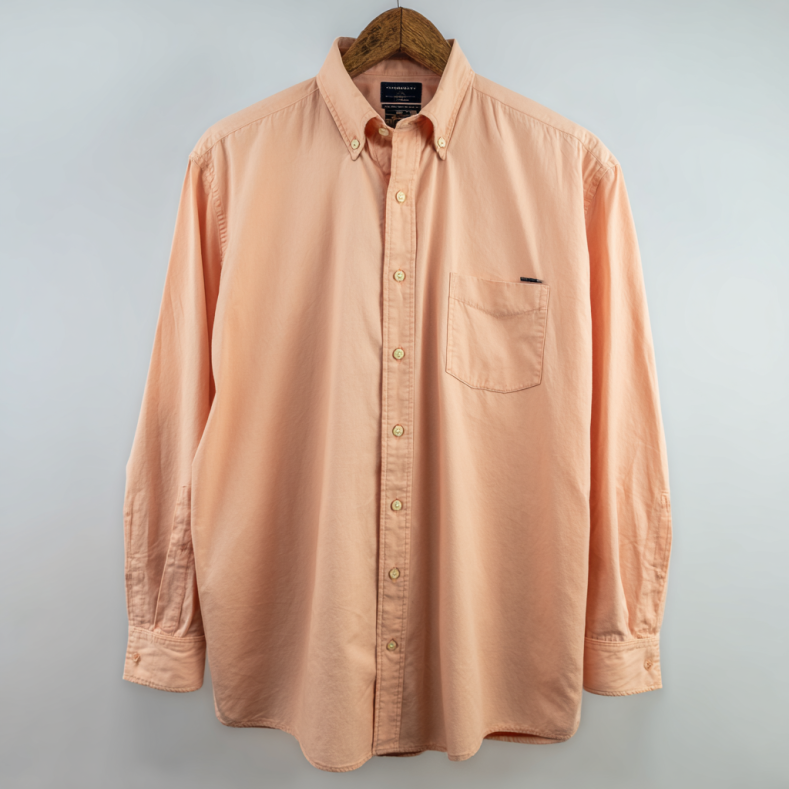 Add a pop of brightness to your wardrobe with this peach-orange button-down shirt from Black Brown 1826. Made from soft woven cotton, this long-sleeve shirt offers a relaxed yet refined look. It features a spread collar, buttoned cuffs, and two chest pockets with button closures, combining style with functionality. Perfect for casual Fridays, weekend outings, or smart casual occasions, this shirt is a must-have for men in size M.